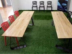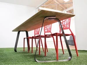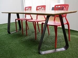 The Twist Table design incorporates 2 steel ribbons that twist around underneath the FCS certified laminated Beech timber tops to provide a stable support structure. At initial glance the legs look very simple, but as you move around the table the slight twist in each leg provides an interesting perspective and gives a clue as to how we’ve managed to triangulate the legs and provide a very stable structure from a few ‘simple’ bends.
